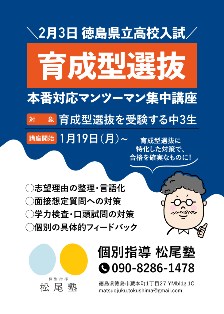 1. なぜその高校を志望するのかを言語化する 2. 自分の経験・強みを具体的に説明できるようにする 3. 面接で「伝わる型」を身につける 正しい視点で整理し、第三者のフィードバックを受けることで、 短期間でも十分に対応可能です。 そこで松尾塾では、徳島県公立高校入試・育成型選抜に特化した短期対策講座を開講します。 【対象】中学3年生 【期間】1月19日〜2月2日 【回数】志望校に応じて適正回数をご提案します。 【形式】完全1対1個別指導 【内容】 ・志望理由の整理・言語化 ・面接想定質問への対策 ・学力検査、口頭試問の対策 ・一人ひとりへの具体的フィードバック その場しのぎの受け答えではなく、本番で自分の言葉として話せる状態を目指します。 本講座は、次のような生徒さまに向いています。 □育成型選抜を本気で考えている □何から準備すればいいか分からない □一人での対策に不安がある 私たちは、合格だけを目的とした表面的な対策は行いません。 自分の考えを整理し、相手に伝える力は、高校進学後も必ず必要になります。 育成型選抜は、その力を育てる良い機会だと考えています。 [お問い合わせ・ご相談について] 定員には限りがあります。 少しでも不安がある方は、LINE・メール・DMにて、まずはお気軽にご相談ください。   迷っている間に時間だけが過ぎてしまうのが、一番もったいないことです。 受験生本人も、保護者の方も、安心して本番を迎えられるよう全力でサポートします!